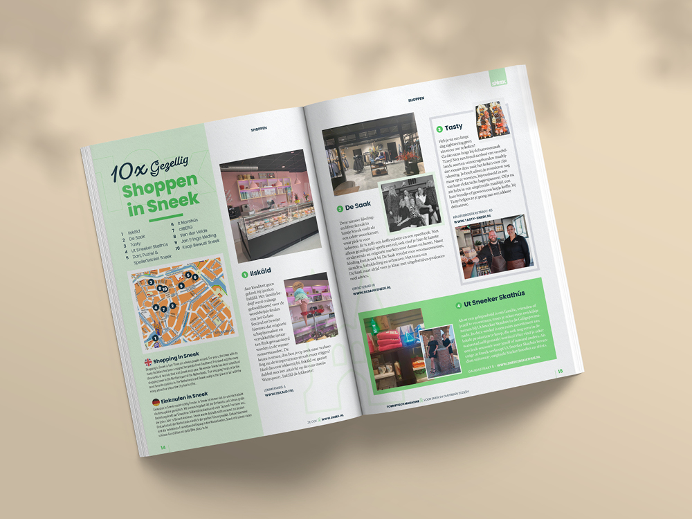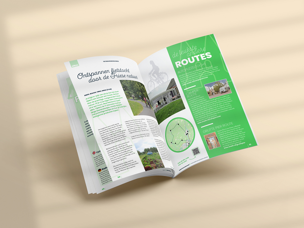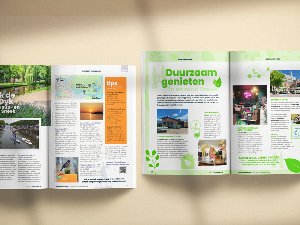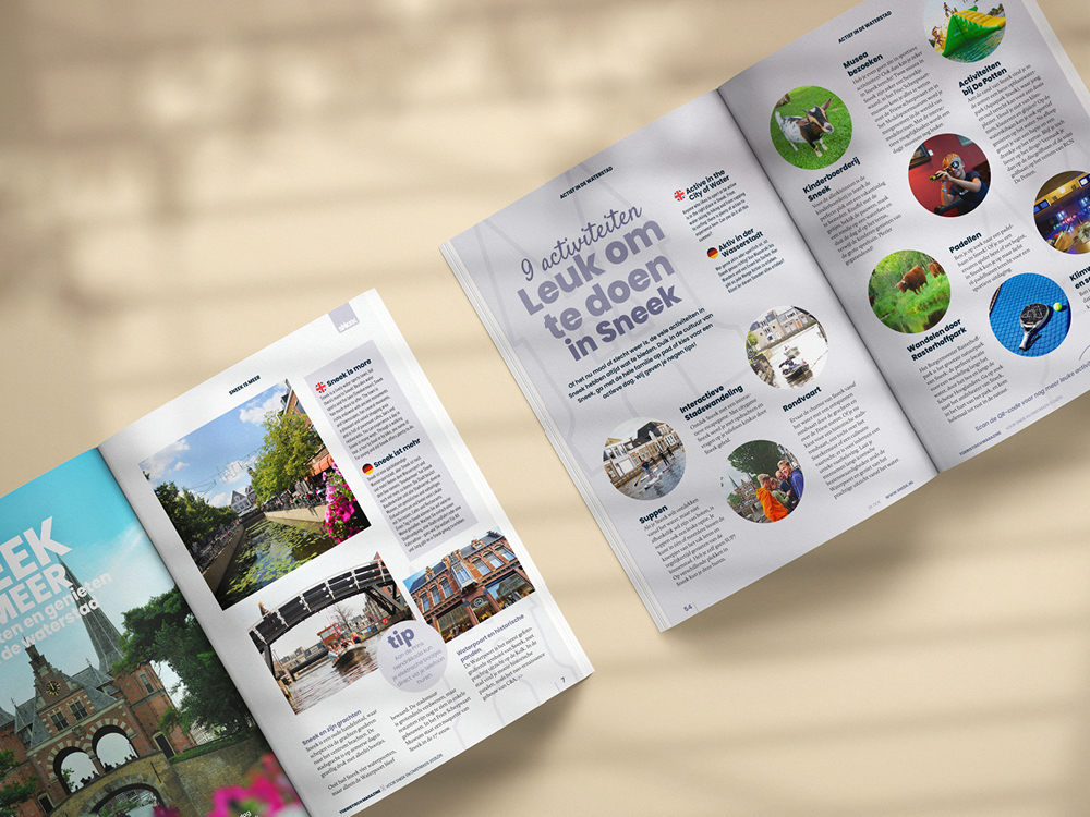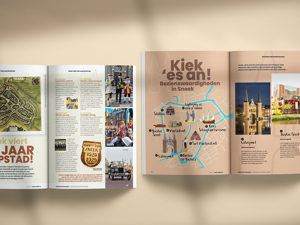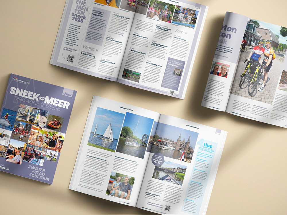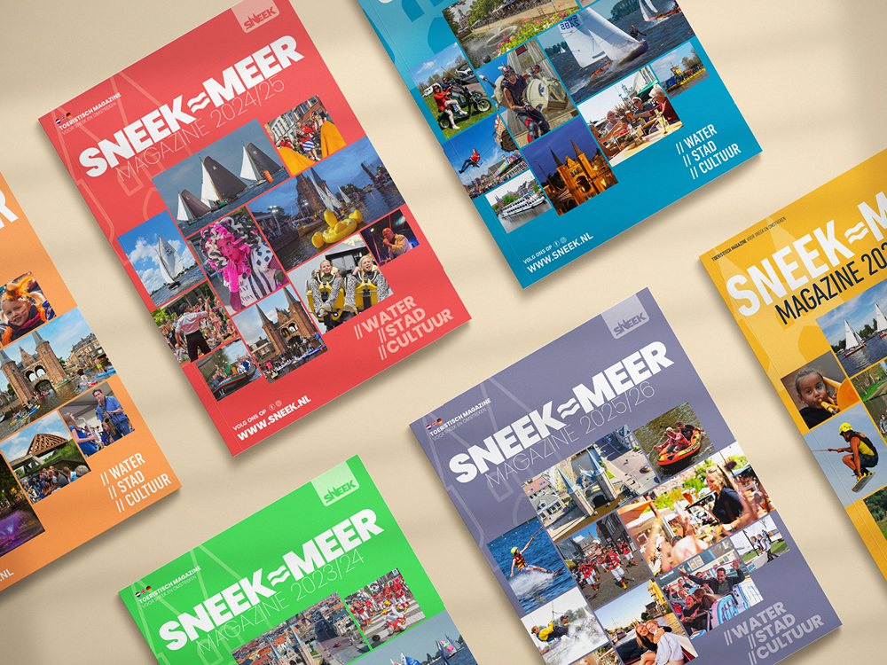 Deze toeristische uitgave mag ik al sinds 2015 namens GrootMedia en Sneek Promotion, van ‘A tot Z’ vormgeven. Ieder voorjaar is dit een leuk samenspel met Petra Miedema van Stichting Sneek Promotion en Marianne Bouwman van GrootMedia. Als echte ‘Snitsers’ weten zij als geen ander de leukste hotspots, uitjes en wetenswaardigheden in Sneek en omstreken. Hierna ga ik met alle creatieve vrijheid aan de slag met deze toeristische inspiratie om dit in een aantrekkelijk eigentijds ontwerp weer te geven. Samen slagen wij erin om ieder jaar weer een herkenbaar en kleurrijk magazine te maken. Een magazine dat er mag zijn! Met het ‘Sneek=Meer’ magazine in de hand, weten toeristen precies wat ze in Sneek kunnen doen en zien. Waar hij/zij wat kan huren, wat zijn de bijzonderheden van en in Sneek zijn en natuurlijk… waar men kan overnachten en/of eten en drinken. Kortom, een ‘must-read’ voor iedere bezoeker aan Sneek.