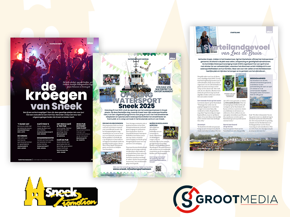 Ook in maart 2025 verscheen aan het begin het toeristische seizoen het ‘Sneek=Meer’ magazine. Hét toeristisch informatieve magazine over de bruisende watersportstad Sneek en omstreken. Het ‘Sneek=Meer’ magazine is helemaal toegespitst op toeristen die naar Sneek en omstreken (willen) komen. Want wat kan je veel doen en zien in Sneek en omgeving. In het magazine vind je alles over de hotspots/bezienswaardigheden, shoppen, culinair genieten, uitgaan, watersport, wandelen en fietsen, tips van Sneker inwoners voor toeristen, activiteiten (binnen en buiten) groepsactiviteiten, evenementen in Sneek en de regio, een handige plattegrond en praktische adressen. Ook is er ruim aandacht voor de vele evenementen in Sneek en regio, want in Sneek is er altijd veel te doen voor jong en oud.